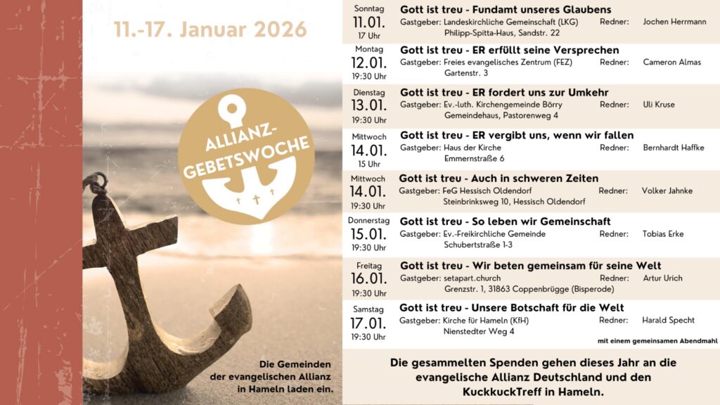 Dafür bieten wir in unserer Gemeinde neben dem sonntäglichen Gottesdienst weitere Veranstaltungen an, um im Glauben und der Gemeinschaft zu wachsen. Auf dieser Homepage findest du Termine und Informationen dazu. – Oder du kommst am besten einfach mal vorbei!